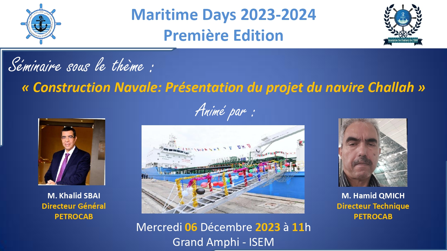 L'Institut Supérieur d'Études Maritimes (ISEM) organise un séminaire inédit sur la construction navale, intitulé "Présentation du Projet du Navire Challah". Cet événement captivant aura lieu le mercredi 6 décembre à 11h au Grand Amphi - ISEM. Sous la houlette de M. Khalid SBAI, directeur général de PETROCAB et M. Hamid QMICH le directeur technique de PETROCAB.
