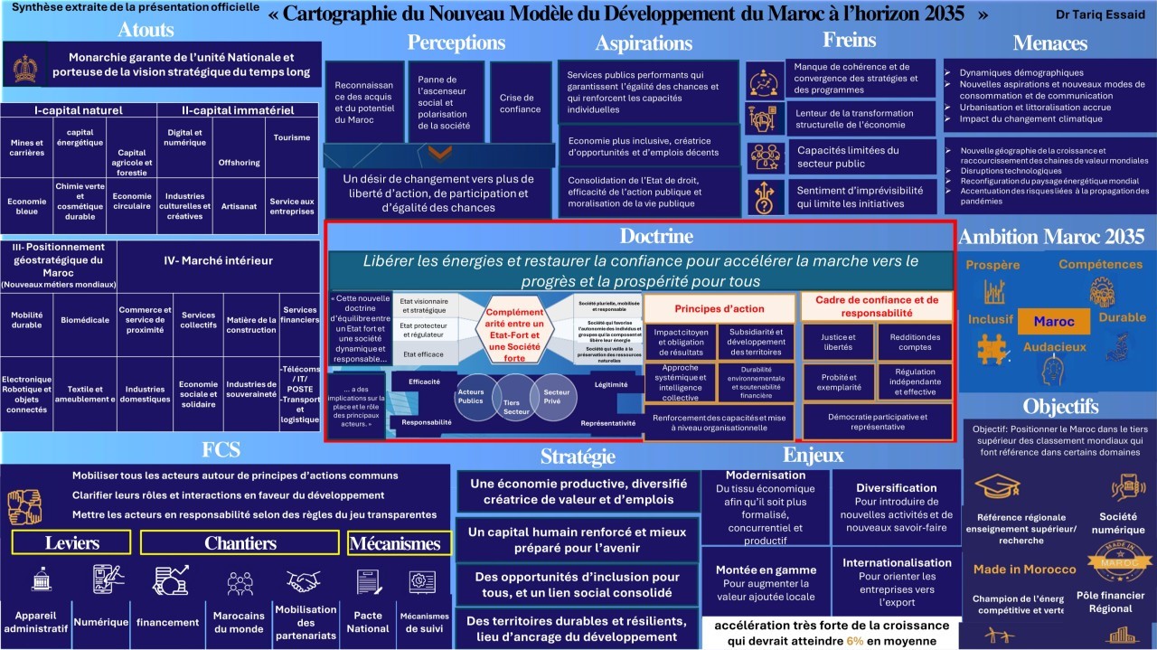 Je partage ici une susnthèse du Nouveau Modèle de Développement, qui a accompagné cette réflexion, avec la conviction que l’économie bleue représente l’un des terrains les plus féconds pour faire vivre, concrètement, les principes de convergence, de synergie et d’action collective au service du développement du Royaume.