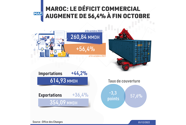 Le déficit commercial du Maroc s’est établi à 260,84 milliards de dirhams (MMDH) au titre des dix premiers mois de cette année, en hausse de 56,4% par rapport à la même période un an auparavant, selon l’Office des Changes.