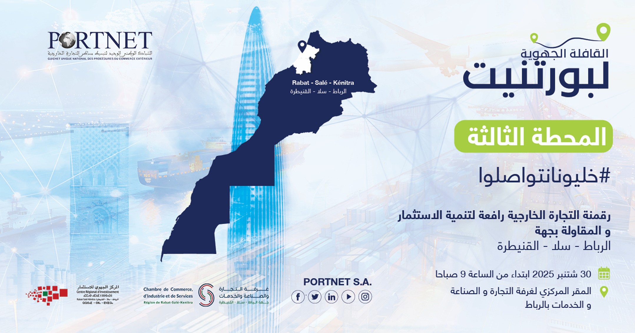Rabat, le 30 septembre 2025 – Dans le cadre de sa stratégie de proximité avec les acteurs économiques, PORTNET S.A. organise la troisième étape de sa Caravane Régionale dans la région de Rabat–Salé-Kénitra, en partenariat avec la Chambre de Commerce, d’Industrie et de Services de Rabat–Salé-Kénitra, le Centre Régional d’Investissement Rabat-Salé-Kénitra et la Délégation du Commerce et de l’Industrie de Rabat.