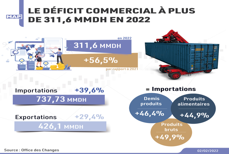 Le déficit commercial du Maroc s’est établi à plus de 311,6 milliards de dirhams (MMDH) en 2022, en hausse de 56,5% par rapport à 2021, selon l’Office des Changes.