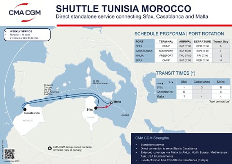 CMA CGM lance un service autonome reliant directement Sfax, Casablanca et Malte, opéré avec deux navires de 800 EVP sur une rotation de 14 jours.