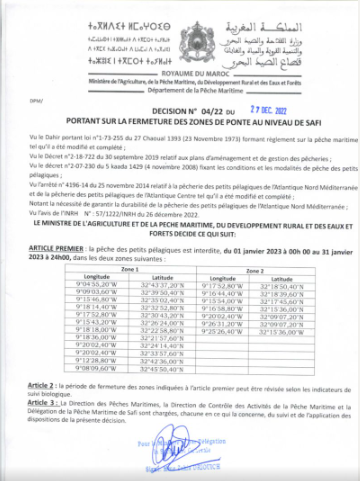 Dans le cadre de la préservation de la ressource halieutique et assurer sa durabilité, le département de la pêche maritime vient d’annoncer l’interdiction de la pêche de la sardine et des poissons pélagiques dans différentes zones de pêche de la côte de Safi et cela du 01 janvier au 31 janvier2023.