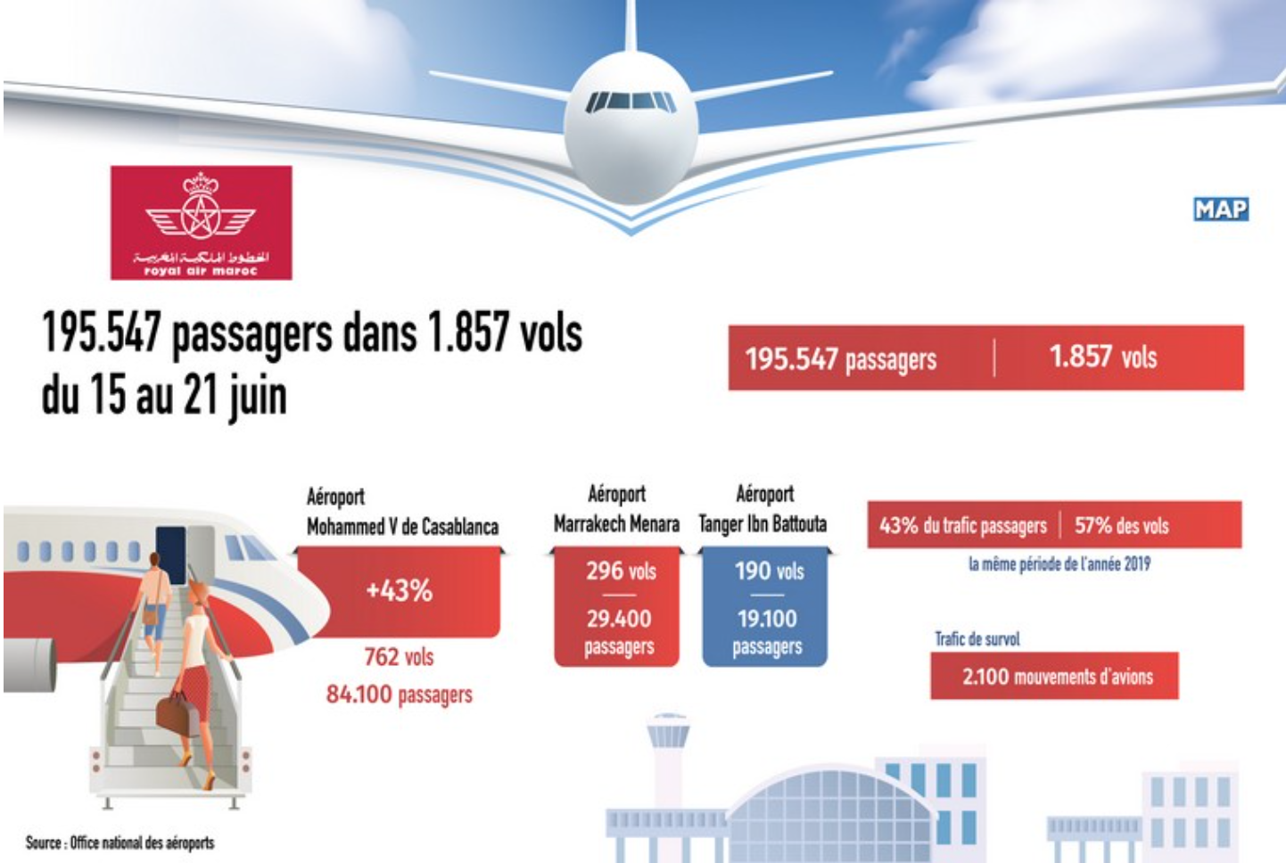 Les aéroports du Royaume ont accueilli, durant la semaine allant du 15 au 21 juin courant, 195.547 passagers à travers 1.857 vols aériens (arrivées et départs internationaux), selon l’Office national des Aéroports (ONDA).