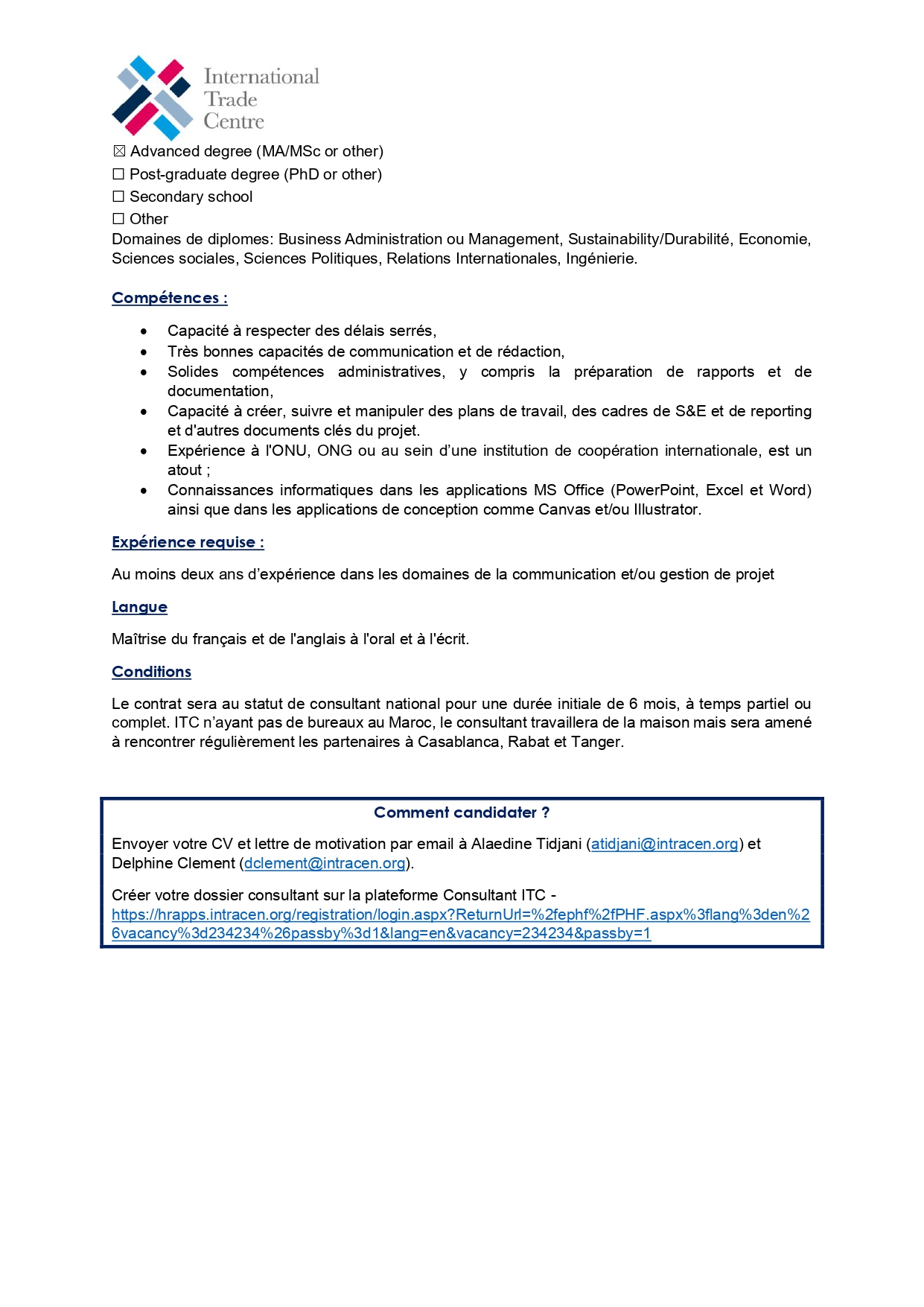 Ne manquez pas cette chance exceptionnelle de faire avancer votre carrière tout en ayant un impact positif sur les communautés locales et régionales. Envoyez dès maintenant votre CV à dclement@intracen.org pour saisir cette opportunité de vous joindre à équipe GTEX MENATEX.