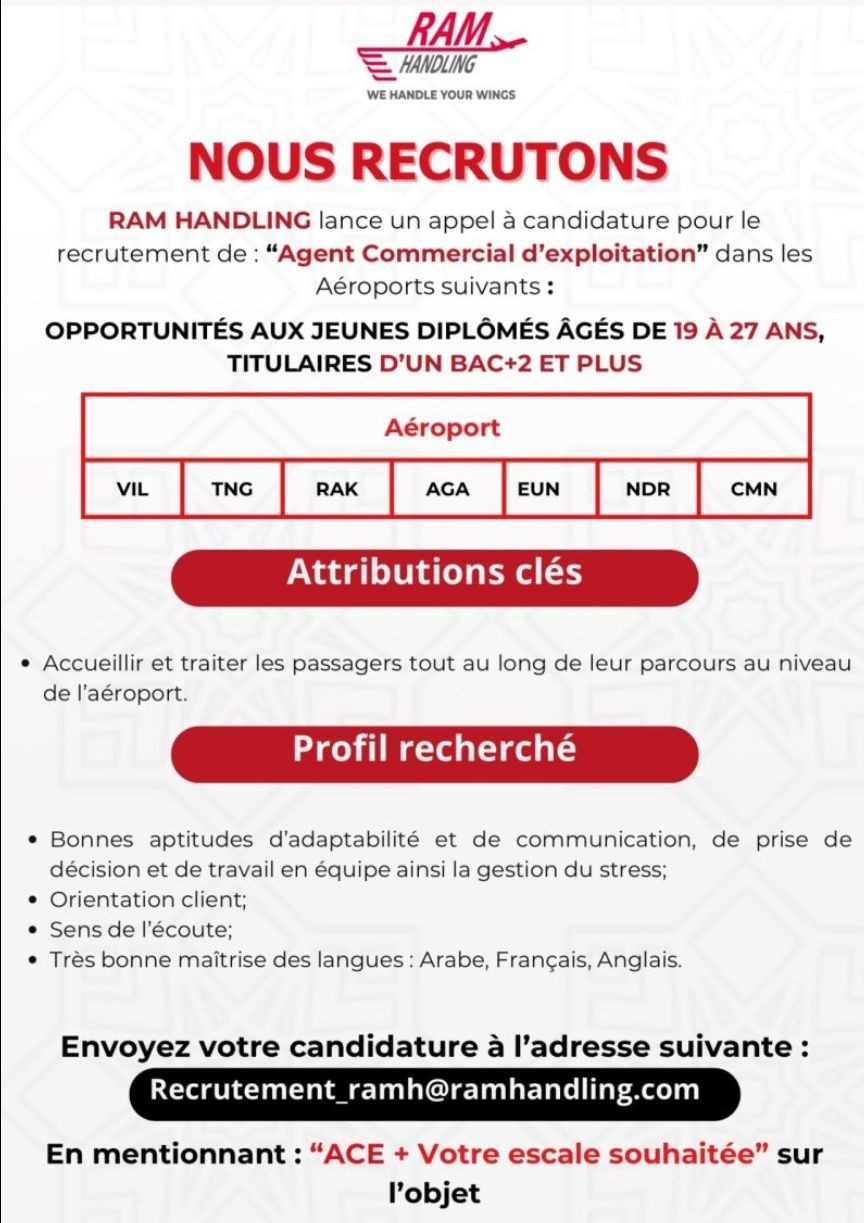 RAM Handling, acteur clé des services aéroportuaires au Maroc, renforce ses équipes et recrute des Agents Commerciaux d’Exploitation pour plusieurs aéroports du Royaume.