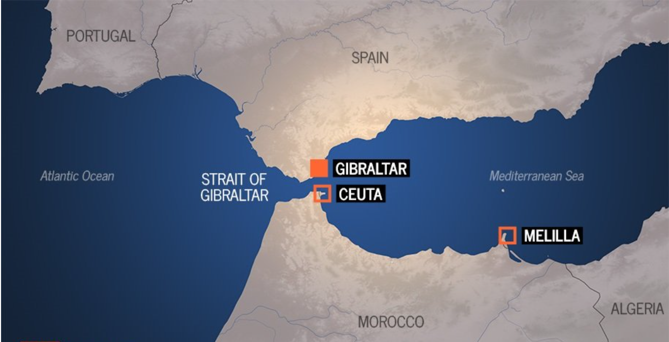 Les villes espagnoles autonomes de Ceuta et Melilla, sur la côte méditerranéenne du Maroc, sont les seules frontières terrestres de l'Union européenne avec l'Afrique. Séparées de l'Espagne par le détroit de Gibraltar, elles constituent le seul moyen d'entrer dans l'UE depuis l'Afrique par la mer sans traverser la Méditerranée.