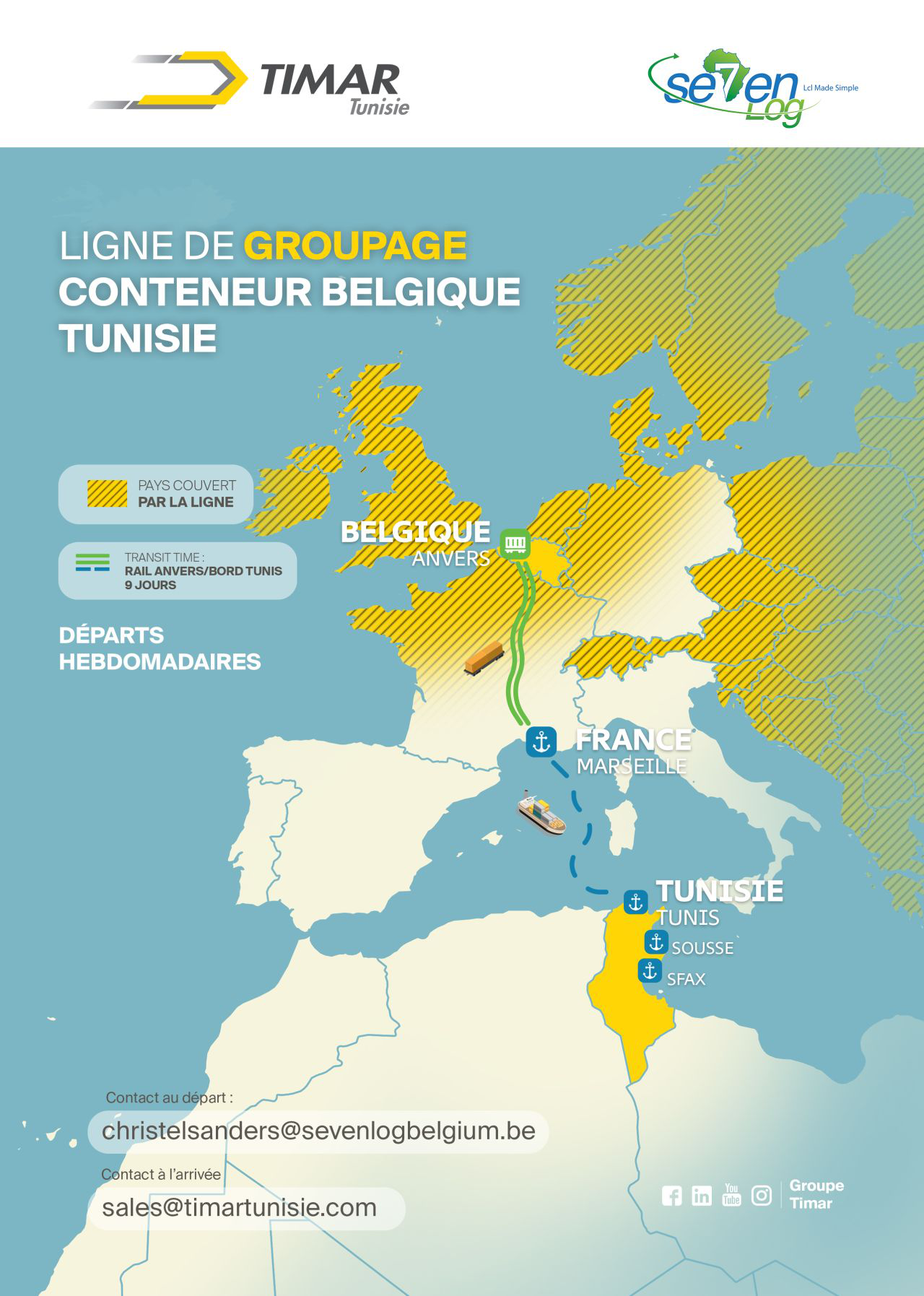 En partenariat avec Sevenlog Belgium Bv Timar lance deux nouvelles lignes maritimes de groupage entre la Belgique et le Maroc et une autre ligne entre la Belgique et la Tunisie. Ces services hebdomadaires répondent à la demande grandissante des importateurs marocains et tunisiens avec des transit Time de 5 et 9 jours.