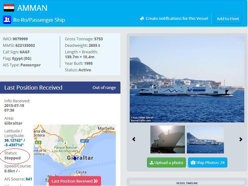 C’est la question que plusieurs se posent aujourd’hui, puisque depuis bientôt trois jours (18 Juillet), le navire C/F AMMAN de la compagnie Intershipping manque à l’appel immobilisé à quai au port d’Algesiras (Voir son AIS consulté ce 21/07/2015 cliquez sur la photo pour y accéder) sans que pour autant le HSC QUEEN NEFERTITI navire de sécurité affrété par l’Etat et actuellement accosté au port de Tanger Med ne puisse entrer en service.