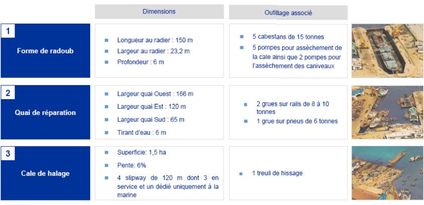 Les infrastructures existantes au sein du chantier de réparation navale de Casablanca permettent d’accueillir des navires d’une longueur allant jusqu’à 140m en cale sèche et 166m à flots.