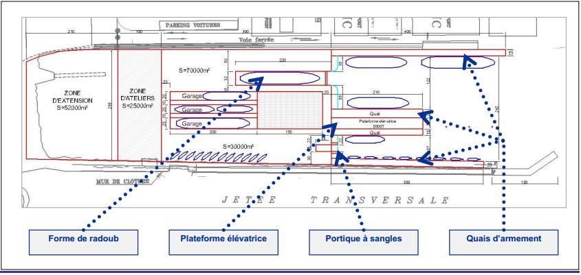 Le chantier de réparation navale de Casablanca compte 3 structures d’accueil : une forme de radoub, des quais de réparation et une cale de halage.