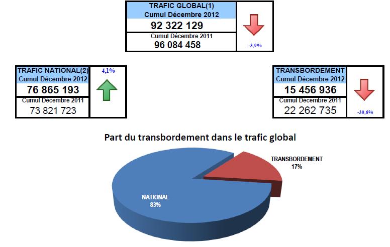 L’activité du transport maritime a enregistré au titre de l’année 2012 un volume global de 92,3 millions de tonnes en baisse de 3,9% en comparaison avec l’année précédente.