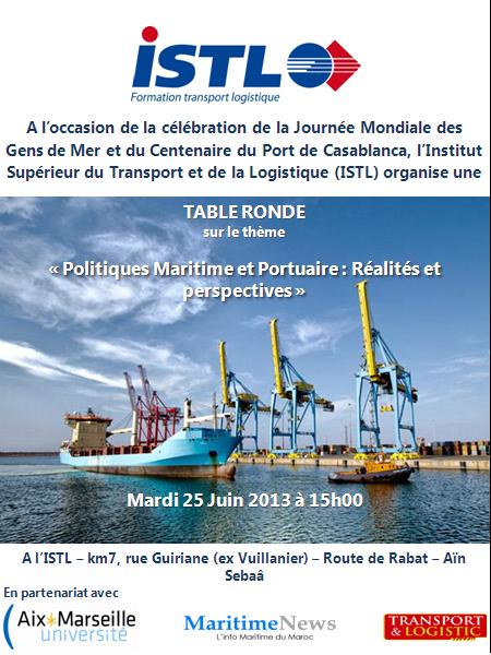 A l’occasion de la célébration de la journée mondiale des gens de mer et le Centenaire du port de Casablanca, l’Institut Supérieur du Transport et de la Logistique (ISTL), organise une table ronde sous le thème : «Politiques Maritime et Portuaire : Réalités et perspectives», le 25 Juin 2013 à 15H à l’ISTL de Casablanca.