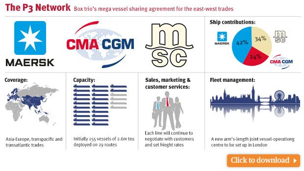 Le réseau P3, dont le lancement était prévu cette année, devait regrouper dans un premier temps 255 navires sur 29 lignes entre l'Asie, l'Europe et l'Amérique. Le but était d'offrir des départs plus fréquents depuis plus de ports avec des bateaux plus chargés, dans un contexte de surcapacité pour le secteur.