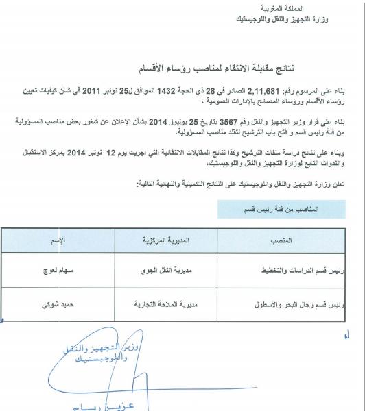 Ainsi, à la Direction de la Marine Marchande Mr Hamid CHOUKI a été nommé chef de la division des gens de mer et de la flotte et Mr Ahmed OUADANI comme chef de la division des affaires administratives.