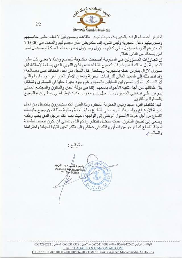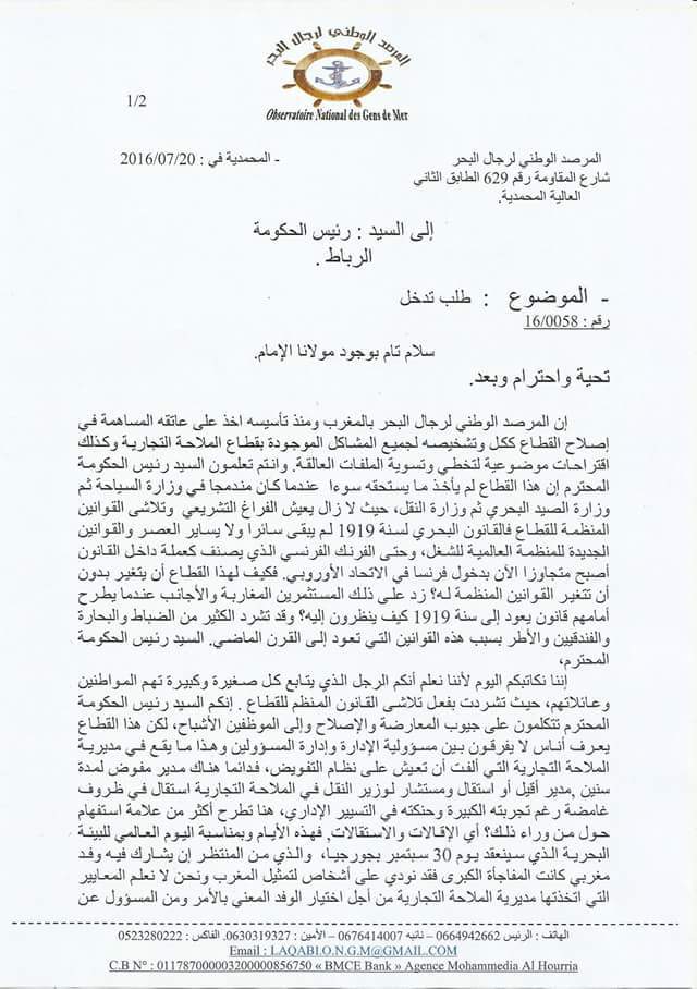 راسل المرصد الوطني لرجال البحر رئيس الحكومة عبد الإله ابن كيران ليساءله عن مصير قطاع البحر و رجاله في ظل حكومة العدالة و التنمية و لم يذكر المرصد في رسالته ولو مرة الوزير المكلف بالقطاع عزيز الرباح بل صب غضبه على مسؤولين في الوزارة.