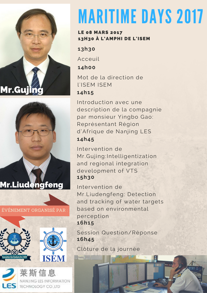 Sous l'égide du Ministère de l'Equipement, du Transport et de la Logistique, l’Association Des Étudiants de l’Institut Supérieur d’Etudes Maritimes (ISEM) de Casablanca(ADEIC) organise le 8 Mars 2017 , la 2ème édition du MARITIME DAYS sous le thème « Domaine maritime et les nouvelles technologies pour une gestion intelligente et efficace : expérience Chinoise».