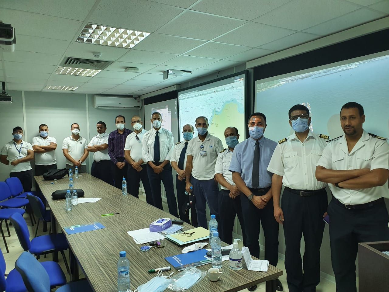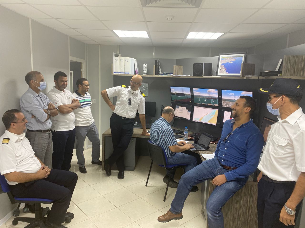 Les pilotes de Tanger Med qui effectuent une session de formation et d’étude en Tanger Med simulateur maritime pour partager leur expérience et se préparer à recevoir les grands porte-conteneurs ULtra de 17 m dans le terminal TM1 port APMTT.