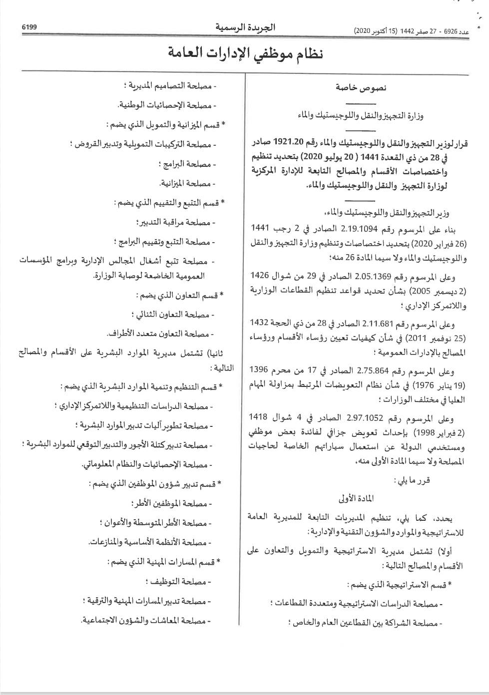 صدر مؤخرا بالجريدة الرسمية قرار وزير التجهيز و النقل و اللوجيستك و الماء، يتعلق بتحديد و تنظيم الأقسام و المصالح المركزية لوزارة التجهيز و النقل و اللوجيستك و الماء. هذا القرار يأتي تبعا لمرسوم تنظيم الوزارة الذي صدر بالجريدة الرسمية منذ بضعة أشهر.