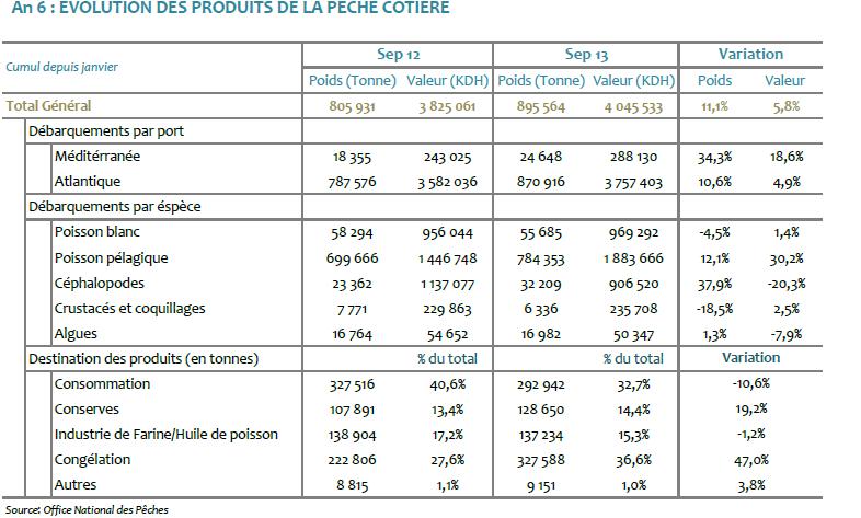 Au terme des neuf premiers mois de l’année en cours, le secteur de la pêche côtière et artisanale a confirmé son évolution positive affichée depuis le début de l’année avec une progression des débarquements de 11,1% en volume et de 5,8% en valeur. La hausse des volumes résulte de l’accroissement de 37,9% des captures de céphalopodes et, dans une moindre mesure, de celle du poisson pélagique (+12,1%).