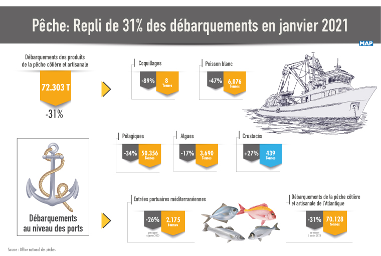 Par produit, les poids débarqués des coquillages, du poisson blanc, du poisson pélagique et des algues ont reculé respectivement de 89% à 8 T , 47% à 6.076 T, 34% à 50.356 T et de 17% à 3.690 T, précise la même source. Les débarquements des crustacés ont, de leur côté, enregistré une hausse de 27% à 439 T.