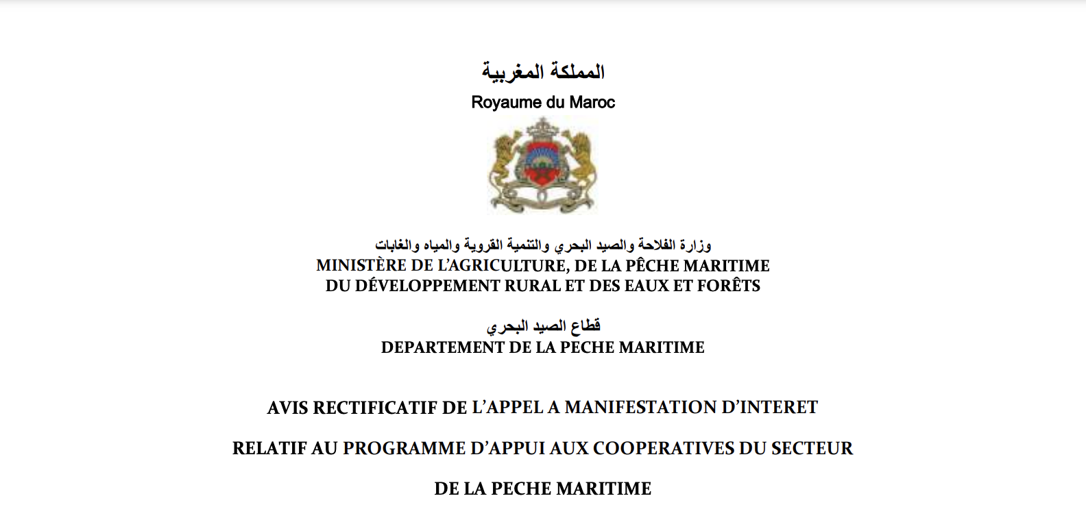 A cet effet, le Ministère de l’Agriculture, de la Pêche Maritime, du Développement rural et des Eaux et Forêts – Département de la Pêche Maritime- invite les coopératives opérant dans le secteur de la pêche maritime désireuses de bénéficier de ce programme à consulter le site web : www.mpm.gov.ma pour télécharger les documents rectifiés relatifs à l’adhésion au programme.