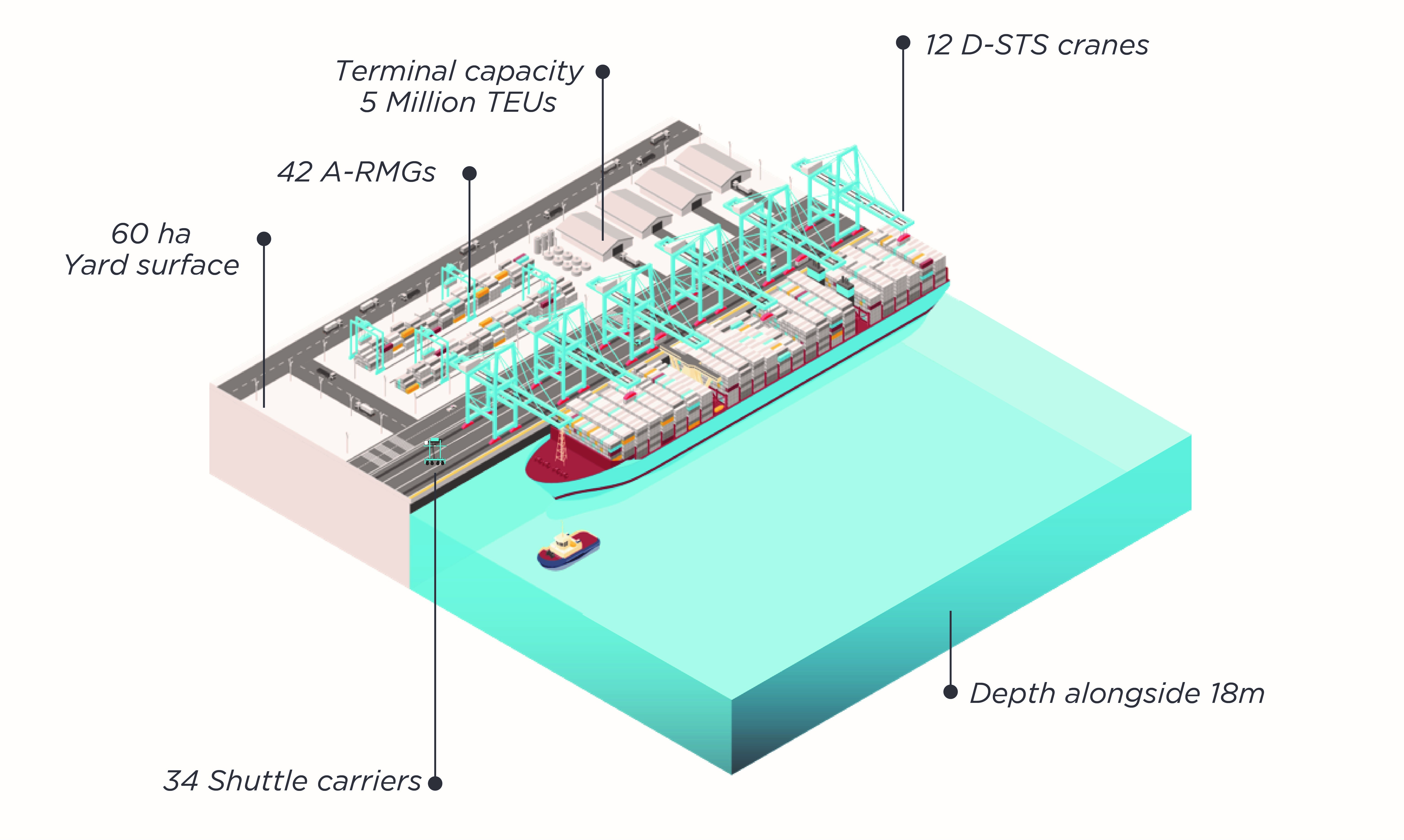 Sur cette première phase, Le terminal s’étend sur 1200 m linéaire, le quai a entre 16 et 18 m de profondeur et est garnit de 12 portiques D-STS, les plus grands au monde, 34 Shuttle carriers assurant la connexion entre les portiques et les 42 A-RMGs dont dispose le parc de 60 hectares. Avec ces équipements, et une main d’œuvre marocaine, jeune et ambitieuse, le terminal est bien disposé à accueillir les plus grands porte-conteneurs actuellement en circulation, et à hisser encore plus l’attractivité du port TangerMed.