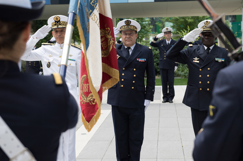 Le contre-amiral Mostafa El Alami, inspecteur de la marine royale marocaine, le contre-amiral Momar Diagne, chef d’état-major de la marine sénégalaise et l’amiral Christophe Prazuck, chef d’état-major de la marine nationale, se sont retrouvés à Paris.