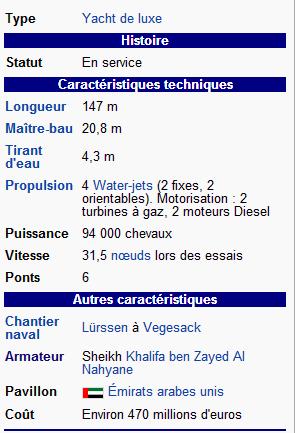 Sa construction a duré 3 ans. Il a été dessiné par Mubarak al Ahbabi et décoré par Christophe Léoni. Le yacht peut emporter jusqu'à 1 000 000 litres de carburants.