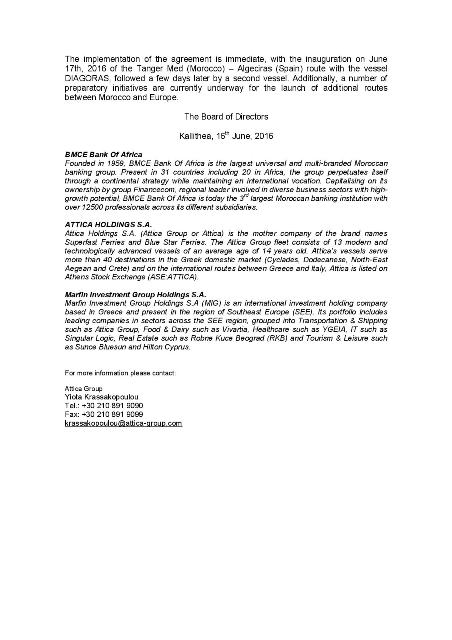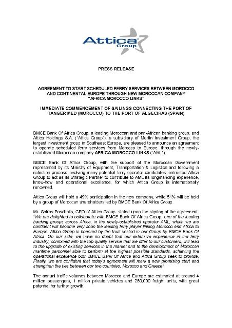 BMCE Bank Of Africa Group, a leading Moroccan and pan-African banking group, and Attica Holdings S.A. (“Attica Group”), a subsidiary of Marfin Investment Group, the largest investment group in Southeast Europe, are pleased to announce an agreement to operate scheduled ferry services from Morocco to Europe, through the newly established Moroccan company AFRICA MOROCCO LINKS (“AML”).