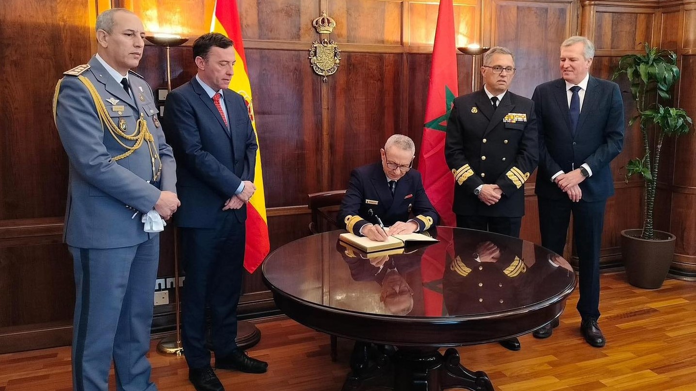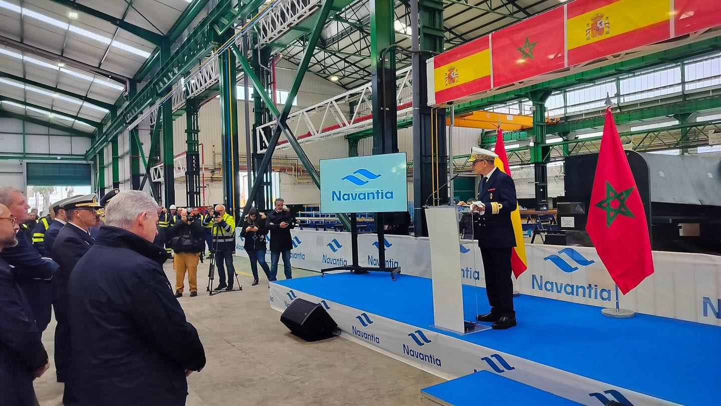 La délégation militaire marocaine, conduite par le contre-amiral Mohamed Al-Tahin, inspecteur de la Marine royale, a été reçue par le président de la société Nqantia, M. Ricardo Dominguez, et le directeur de l'unité industrielle, M. Antonio Rodriquez. Après de brèves conversations avec les deux responsables espagnols mentionnés ci-dessus, l'inspecteur de la Royal Navy a signé le livre d'or de l'entreprise avant de se rendre dans les ateliers de fabrication où s'effectuaient les travaux de découpe de la tôle du navire. La cérémonie de découpe de la première plaque de métal dans les traditions maritimes est un événement important qui marque le début des travaux de fabrication de la coque du navire après la signature préalable du contrat pour son acquisition.