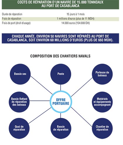 Pour ce qui est du port casablancais, les services sont assurés par les Chantiers et ateliers du Maroc (CAM), et permettent de réparer annuellement une cinquantaine de bateaux. À ce niveau, il faut souligner que la réparation navale à sec constitue le segment le plus demandé, en comparaison avec la réparation à flot.