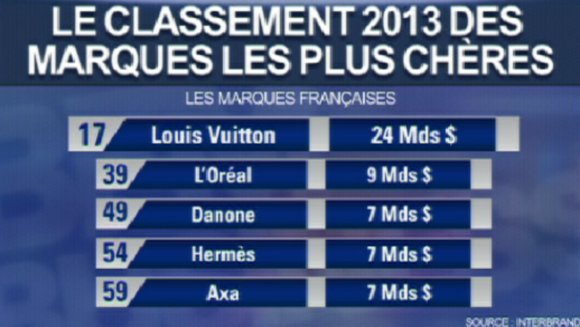 Du côté des marques françaises, la première du classement est Louis Vuitton, à 24 milliards de dollars, à la 17ème place. Viennent ensuite L'Oréal, Danone, Hermès, et Axa. L'assureur est très bien placé parmi les grandes marques de la finance et de l'assurance mondiales.