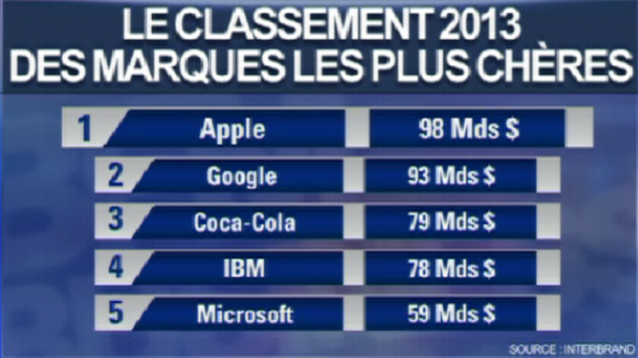 La valeur d'Apple est estimée à 98 milliards de dollars par Interbrand, "multipliée par quinze depuis son entrée dans le classement en 2000". Suit Google, à 93 milliards de dollars. Dans les plus fortes progressions du classement, on retrouve Facebook, Google, Apple et Amazon… Des "marques globales qui impactent la vie des individus sur tous les continents", estime le spécialiste des marques.
