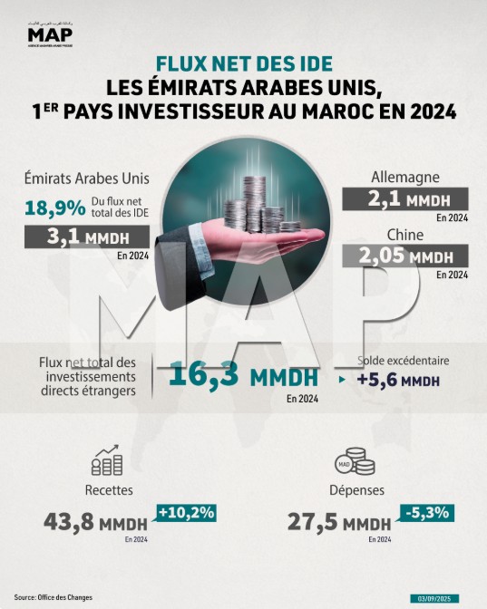 Les Émirats Arabes Unis se sont hissés au rang du premier investisseur au Maroc au titre de l’année 2024, avec une part de 18,9% du flux net total des investissements directs étrangers (IDE), selon l’Office des Changes.