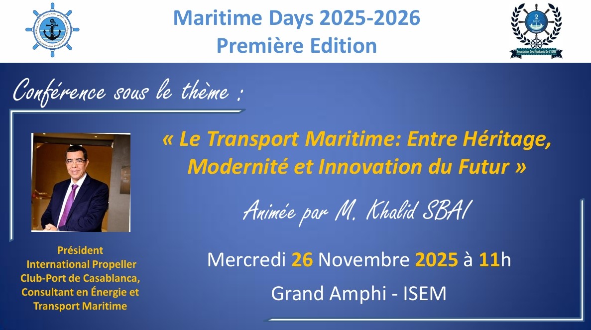 Dans le cadre du lancement de la première édition des Maritime Days 2025-2026, l’ISEM organise une conférence exceptionnelle autour du thème : « Le Transport Maritime : Entre Héritage, Modernité et Innovation du Futur ».