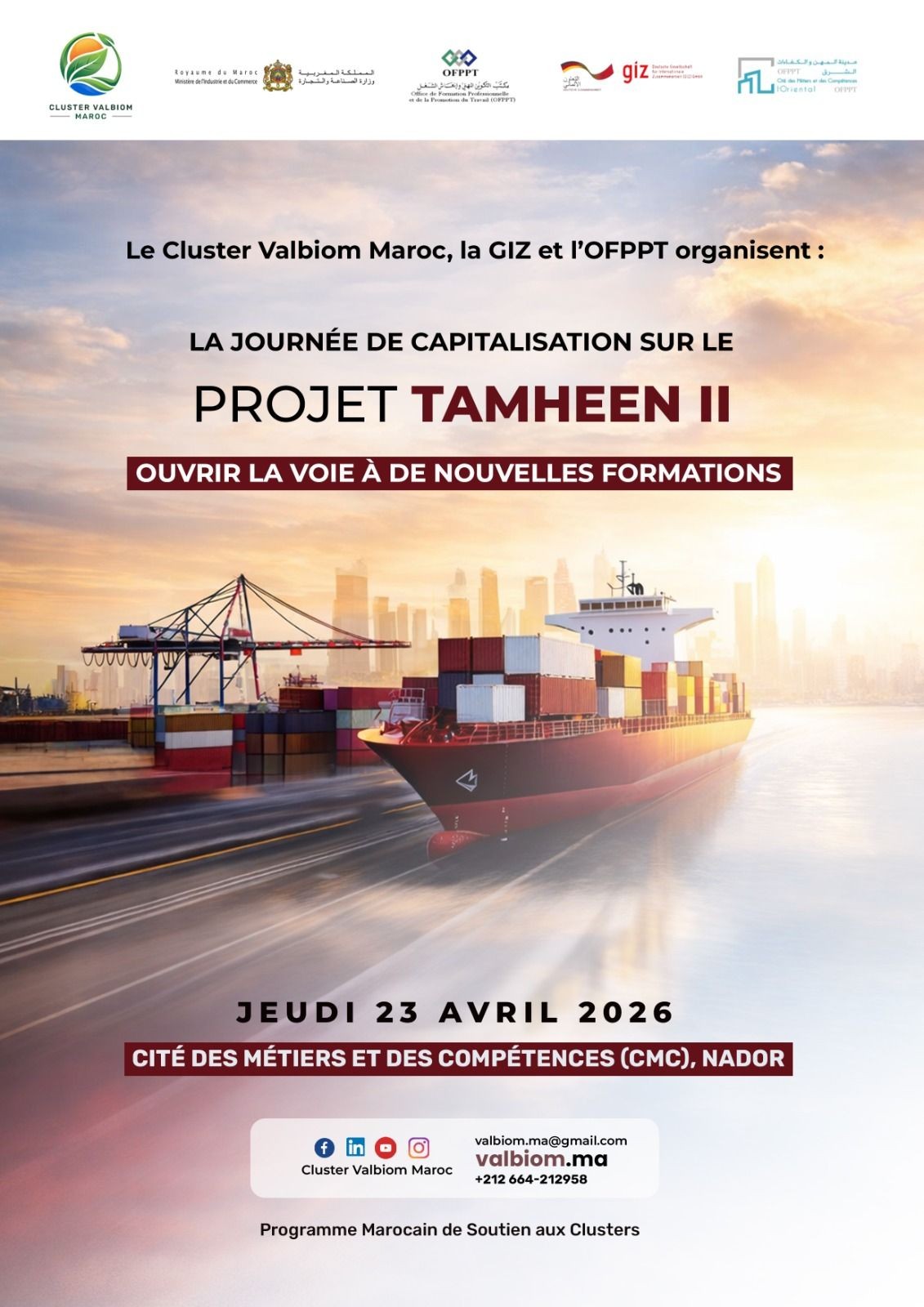 Pour célébrer la clôture de ce programme de formation, le Cluster Valbiom Maroc, en partenariat avec la GIZ et l’OFPPT, organise la Journée de capitalisation du projet Tamheen II. Placée sous le thème « Ouvrir la voie à de nouvelles formations », cette rencontre constituera une occasion privilégiée pour mettre en lumière les principaux résultats du projet, partager les bonnes pratiques développées et explorer les perspectives d’évolution du secteur, notamment dans la région de l’Oriental.