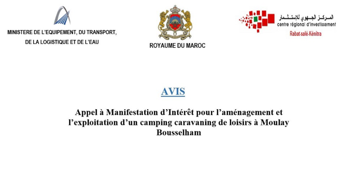 La Commission Régionale Unifiée de l’Investissement de la Région de Rabat-Salé-Kénitra et la Direction Régionale de l’Equipement du Transport, de la Logistique et de l’Eau de Rabat-Salé-Kenitra lancent un Appel à Manifestation d’Intérêt relatif à l’aménagement et l’exploitation d’un camping caravaning de loisirs à Moulay Bousselham.