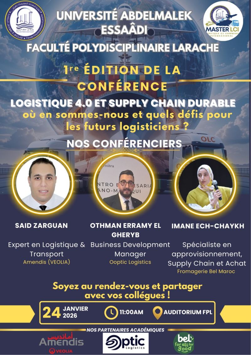 J’ai l’honneur d’annoncer ma participation en tant que conférencier à la 1ʳᵉ édition de la Conférence en Logistique, Supply Chain et Commerce International, organisée à la Faculté Polydisciplinaire de Larache (FPL).