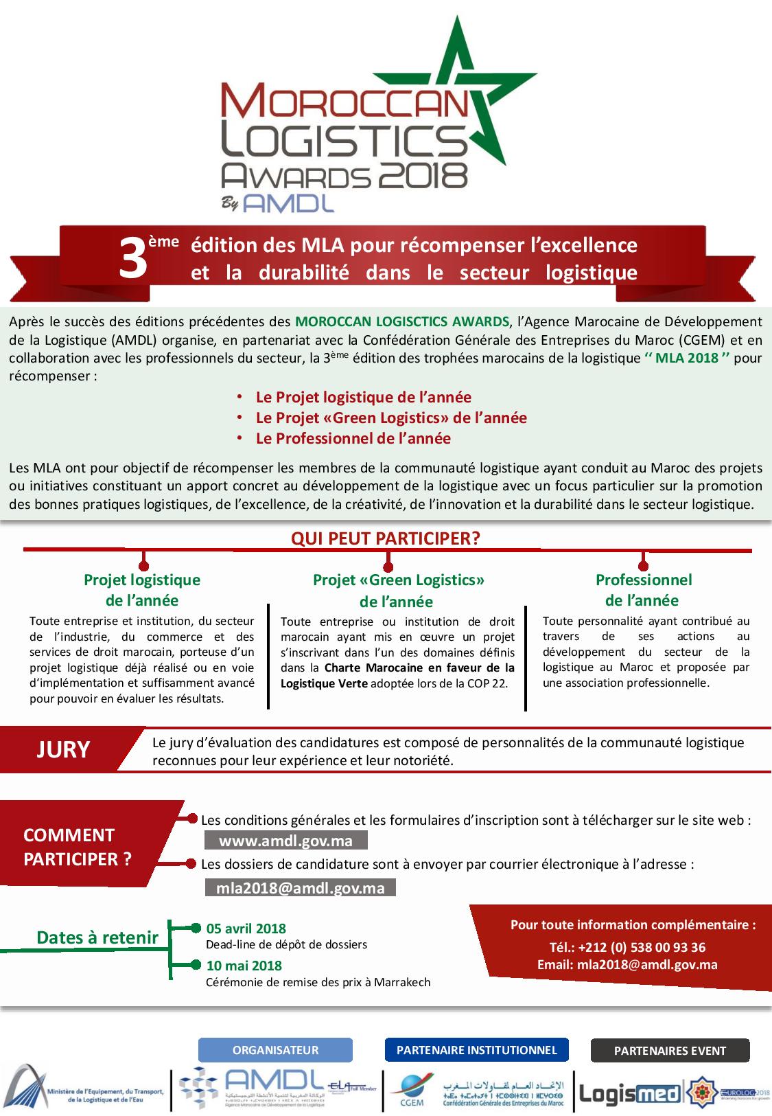 Les gagnants des MLA 2018 seront dévoilés lors d’une cérémonie qui sera organisée à Marrakech le jeudi 10 mai 2018 en marge de la tenue de la 24ème édition du Congrès International de la Logistique Eurolog 2018.