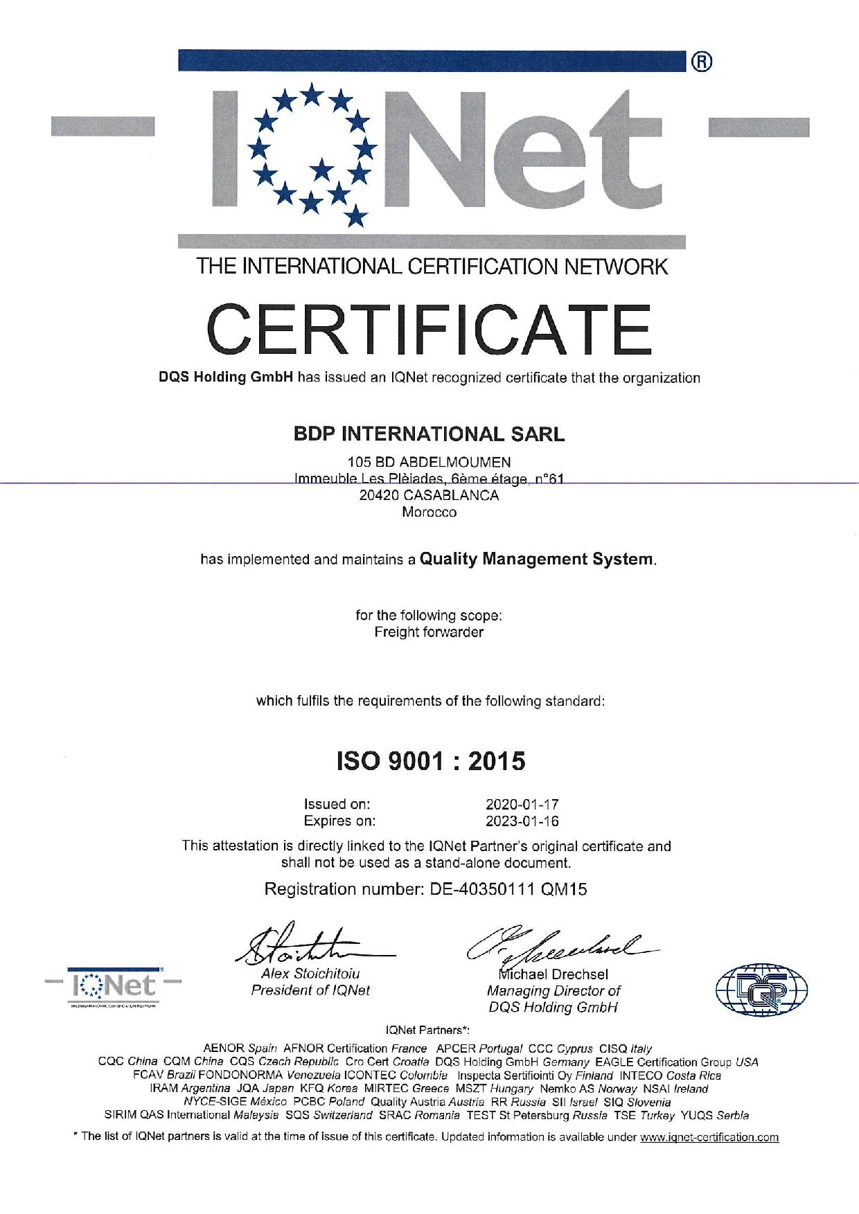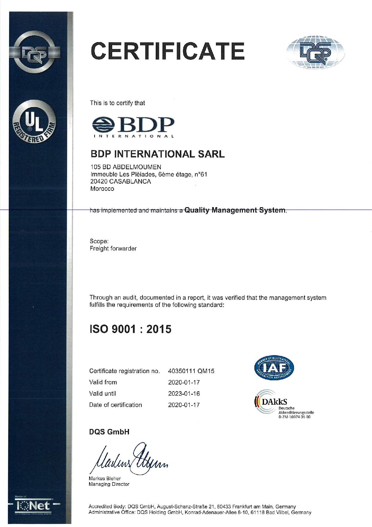 A ce propos, Mr Abderrahim MSAIDI, Directeur Général BDP International Maroc déclare "Après trois ans de son implantation au Maroc et à travers sa filiale locale, le Logisticien Américain BDP International est désormais certifié ISO 9001 : 2015 pour son Système de Management Qualité et ce depuis le 17 Janvier 2020, par le cabinet Allemand DQS.