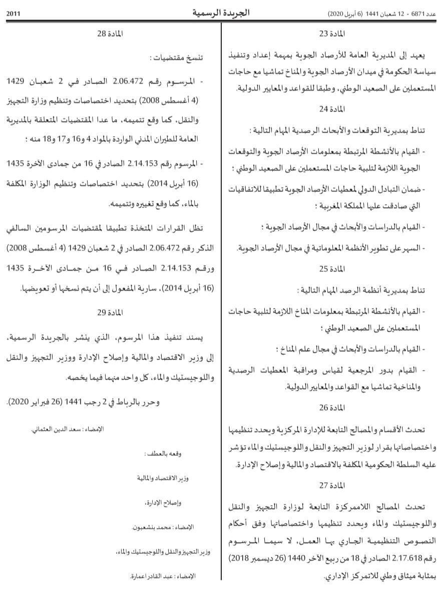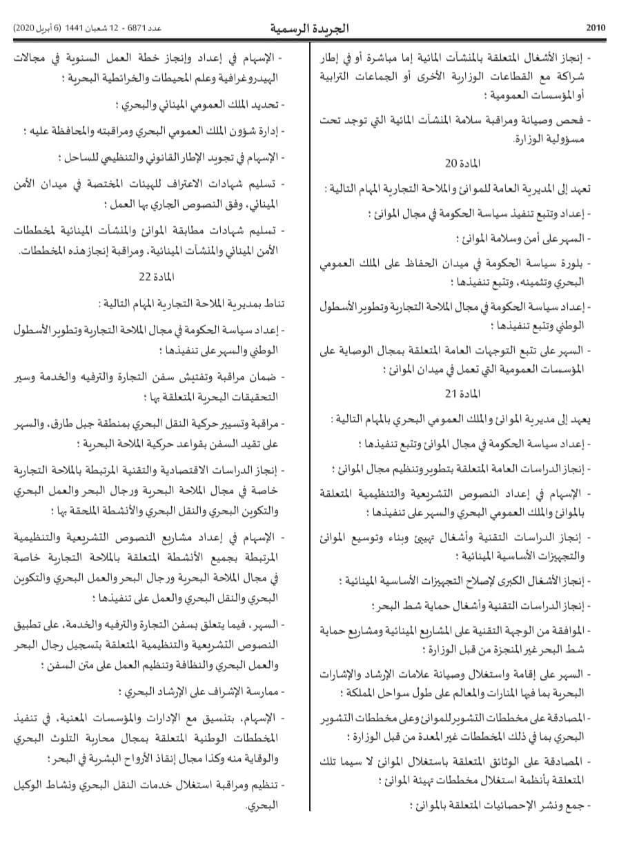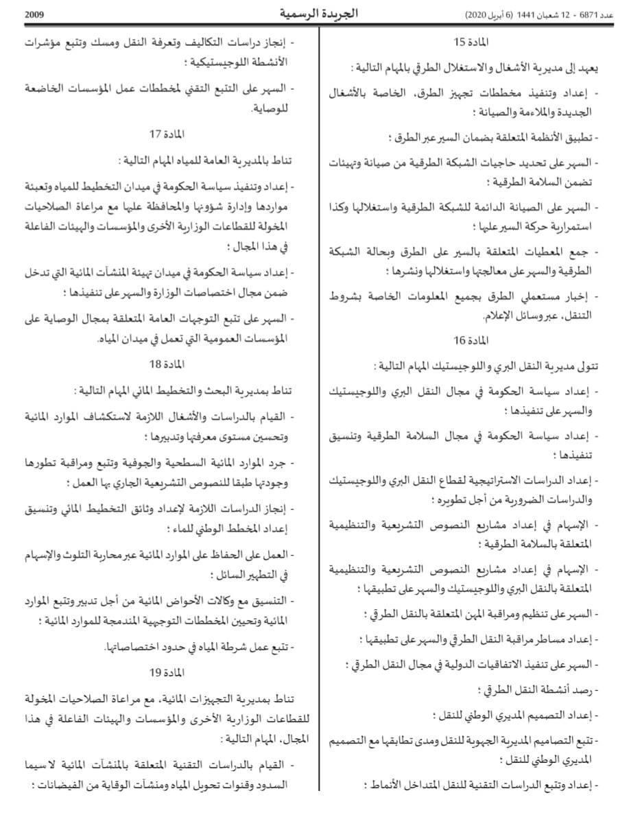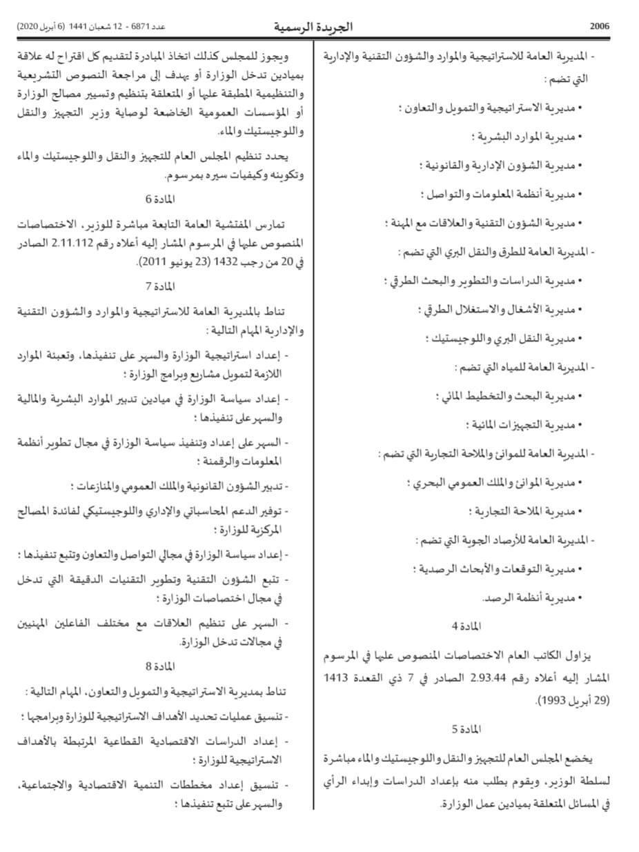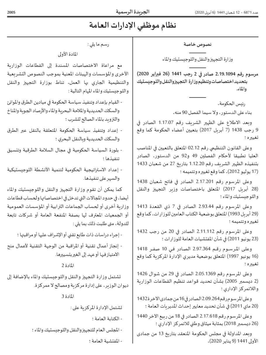 صدر بالجريدة الرسمية للسادس من أبريل 2020، مرسوم بالهيكلة الجديدة لوزارة التجهيز و النقل و اللوجستيك و الماء. الهيكلة الجديدة و الإختصاصات المؤطرة لها، تروم تعزيز الإنسجام و التكامل بين مختلف المجالات التي تشرف عليها الوزارة، و المتفرعة عن قطاعات التجهيز