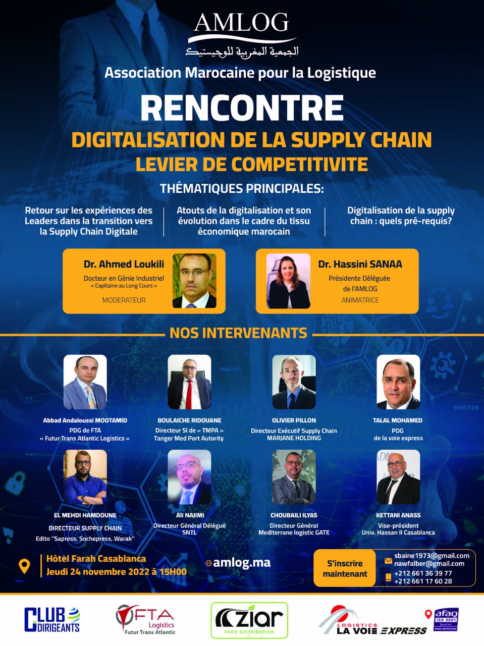 L'AMLOG "Association Marocaine pour la Logistique" organise une rencontre le jeudi 24 novembre à 15h sur le thème : " Digitalisation de la Supply Chain : Levier de compétitivité ".