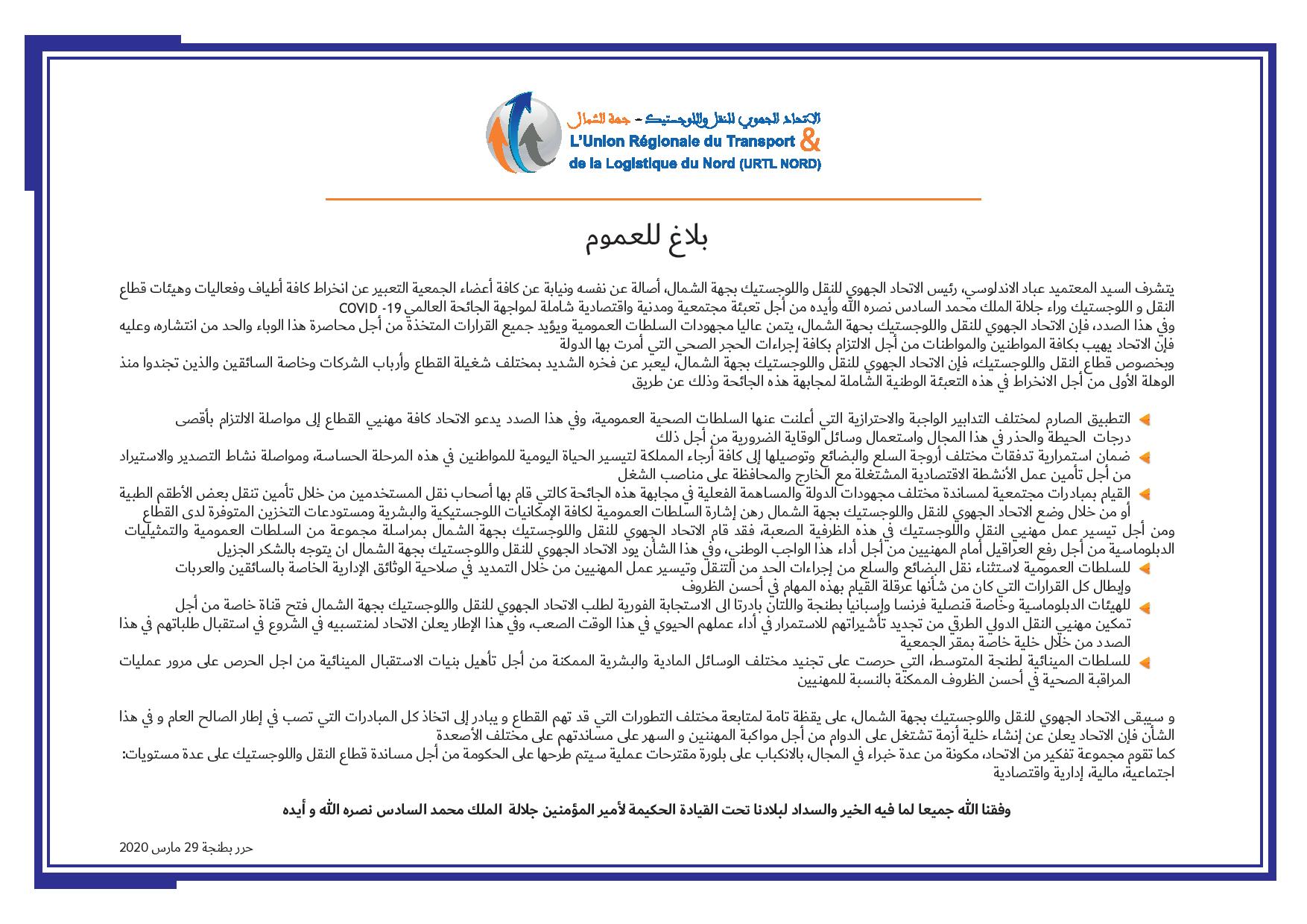 بلاغ للعموم من الاتحاد الجهوي للنقل واللوجستيك بجهة الشمال
