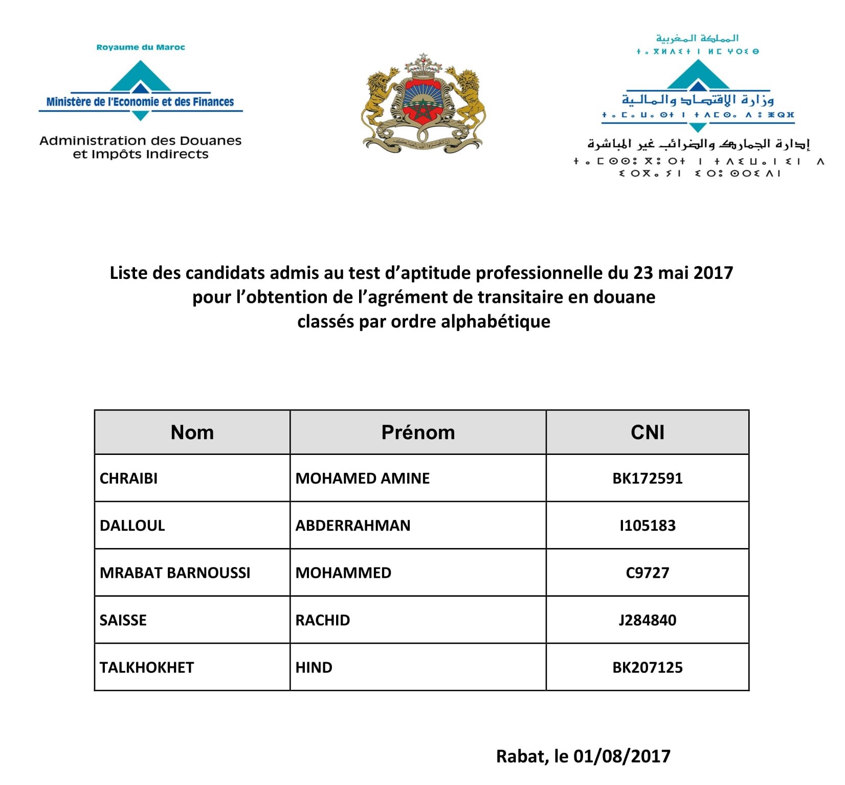 La Douane vient de publier la liste des candidats admis au test d’aptitude professionnelle du 23 mai 2017 pour l’obtention de l’agrément de transitaire en douane.