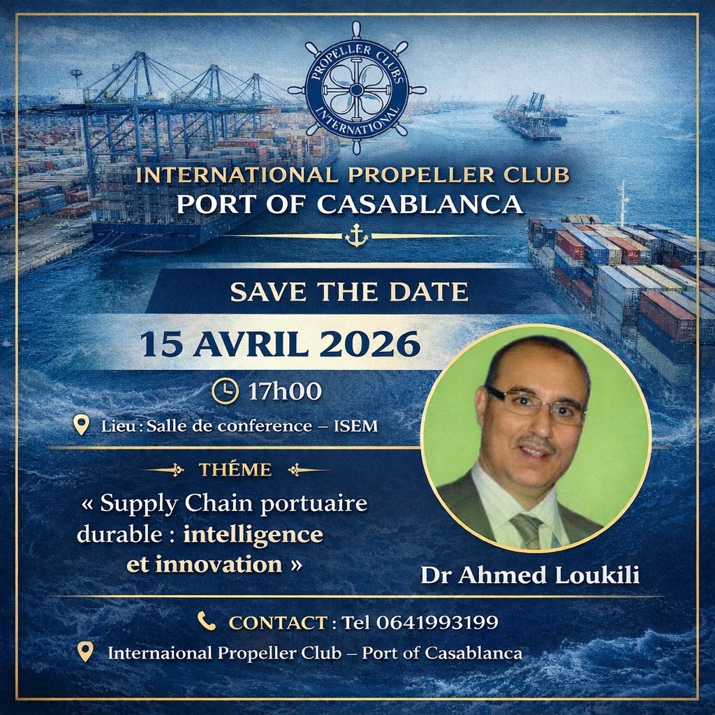 L'International Propeller Club, Port de Casablanca organise à la nouvelle salle de conférence de l'ISEM le 15 avril 2026 à 17h00, un séminaire sur le thème :« Supply Chain portuaire durable : Intelligence et Innovation ».