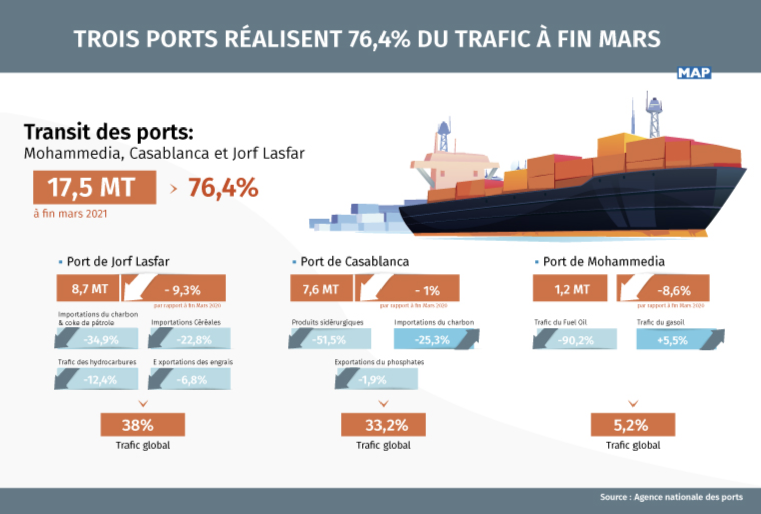 Représentant environ 33,2% du trafic global, le port de Casablanca a assuré le transit de 7,6 MT à fin Mars 2021, soit une baisse de 1% par rapport à la même période de l’année précédente. Ce recul est dû à la baisse des produits sidérurgiques (-51,5%), des importations du charbon (-25,3%) et des exportations du phosphates (- 1,9%).