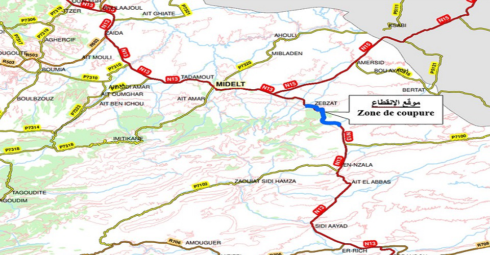 Le Ministère de l’Equipement et de l’Eau annonce que la circulation sera coupée pendant une durée de 3 heures, le mercredi 2 février 2022 de 09h00 à 12h00 sur le tronçon routier reliant Midelt à Errich de la route nationale n° 13 au niveau du col Tizi N’talghomt relevant de la commune territoriale Amersid – Province de Midelt. Ladite coupure va permettre la réalisation des travaux de terrassement dans le cadre de l’élargissement et du renforcement de ce tronçon.
