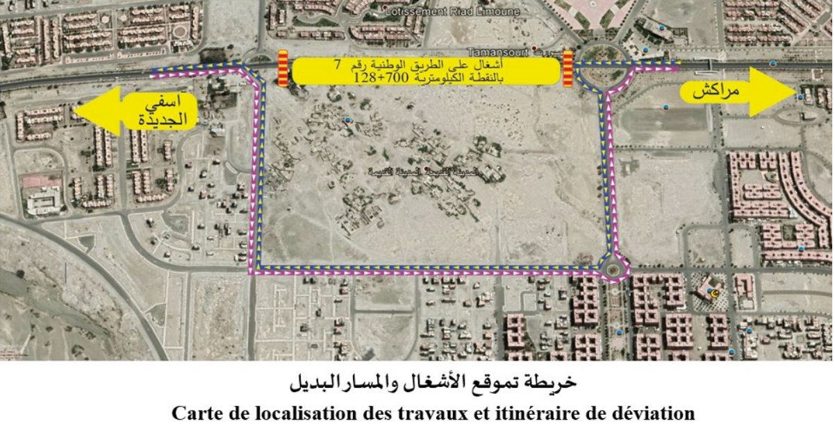 Le Ministère de l’Equipement, du Transport, de la Logistique et de l’Eau annonce que la circulation sur la route nationale n°7 reliant Marrakech à Safi et El Jadida, au niveau de la section entre la ville de Tamansourt et Oued Lagssab, connaitra une perturbation momentanée, le vendredi 2 juillet 2021 de 09H00 à 17h00, en raison des travaux de pose d’une passerelle métallique pour piéton sur ladite section au point kilométrique 128+700.