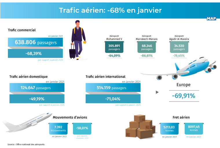 Les aéroports marocains ont accueilli 638.806 passagers en janvier 2021, en chute de 68,39% par rapport à la même période une année auparavant, selon l’Office national des aéroports (ONDA).